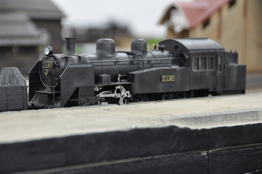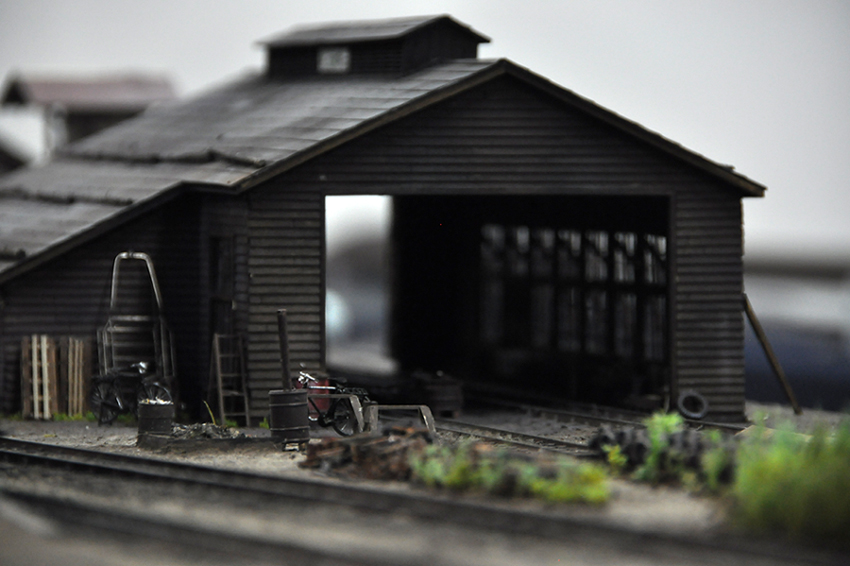 本日の記事のトップの写真は、画面向かって右手の車両庫と手前の跨線橋との間に作られた情景でした。