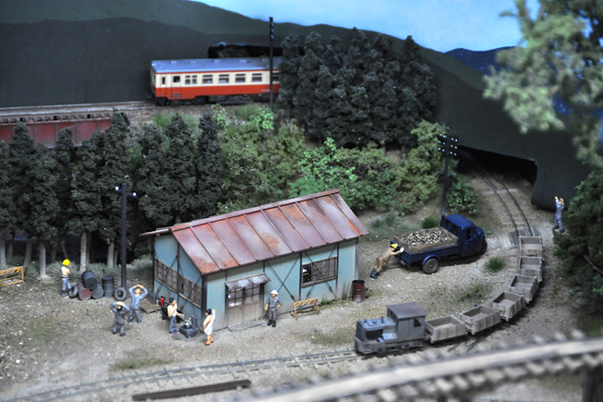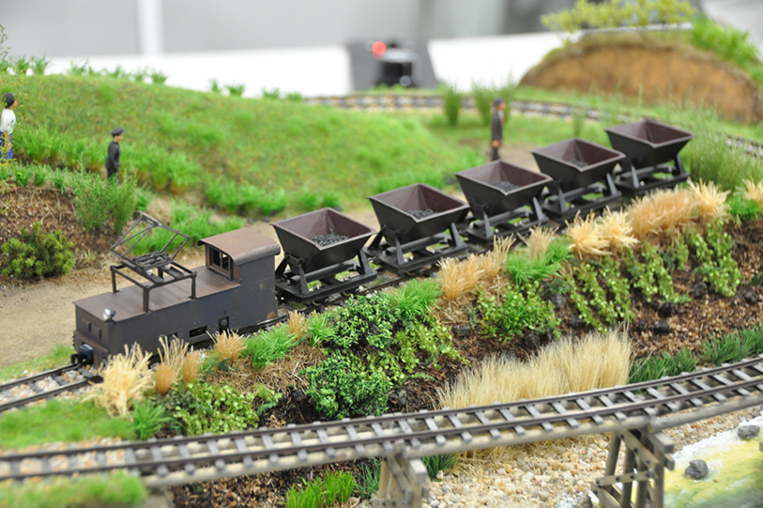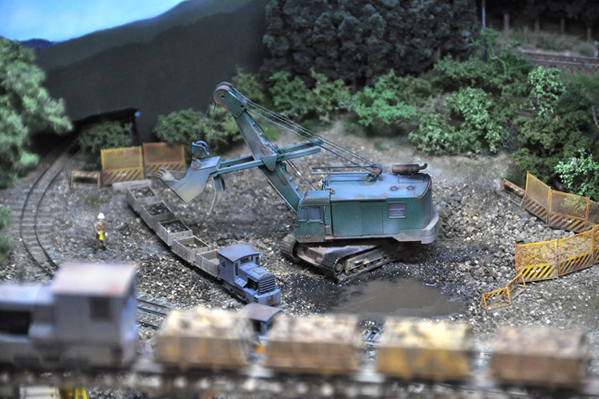実は一番手前にはOナロー(ボケて写っている線路がそれ)、奥にはHOナローが走っているのですが、スケールの違うものを巧みに組み合わせることで、見事な遠近感を表現されています。