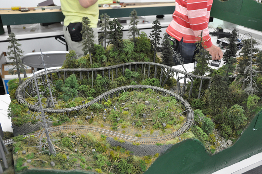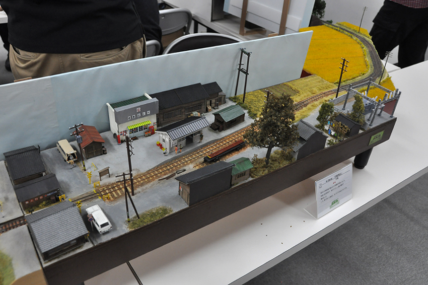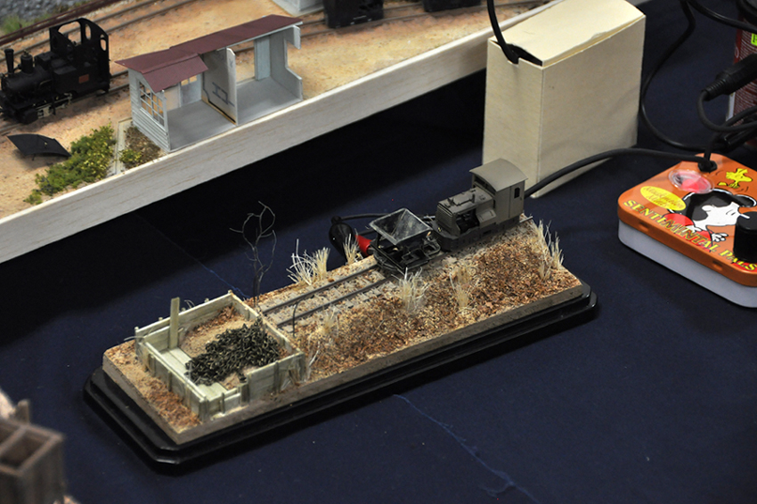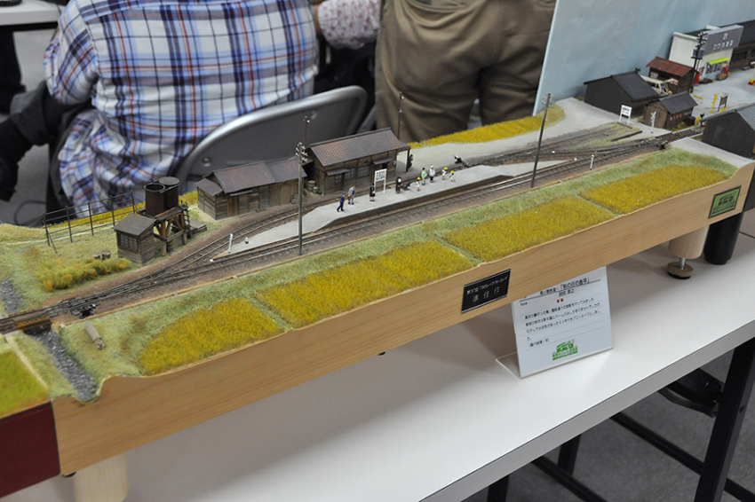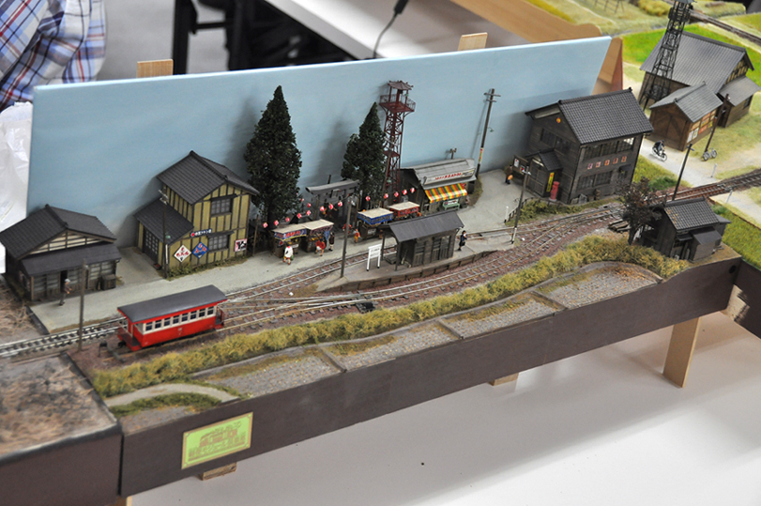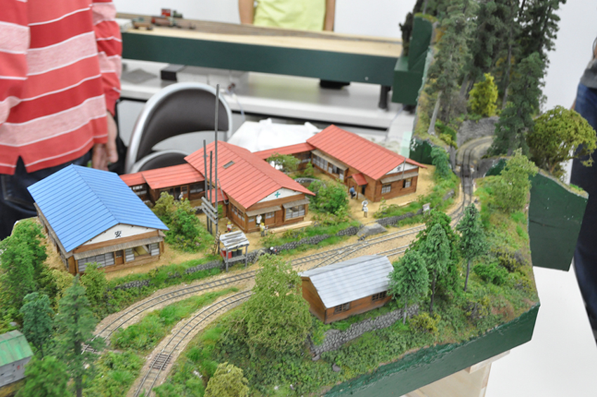 尾小屋鉄道をテーマに作られたモジュールの数々がループ状に連結されています。