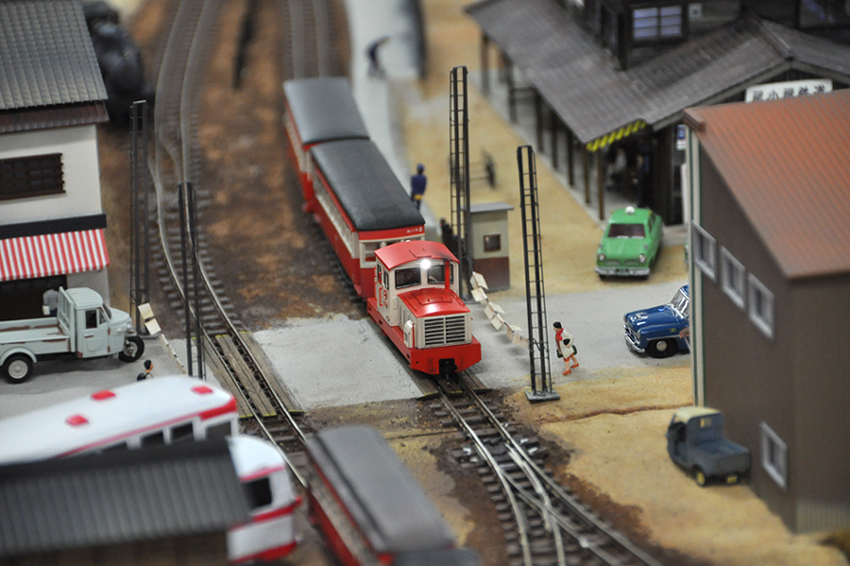 ↑こちらも一見してループしている様に見えますが、奥の方で自動車がレールの上で立ち往生していて、その手前でロコがストップ→逆向きに走り出す・・・という動きをします。
