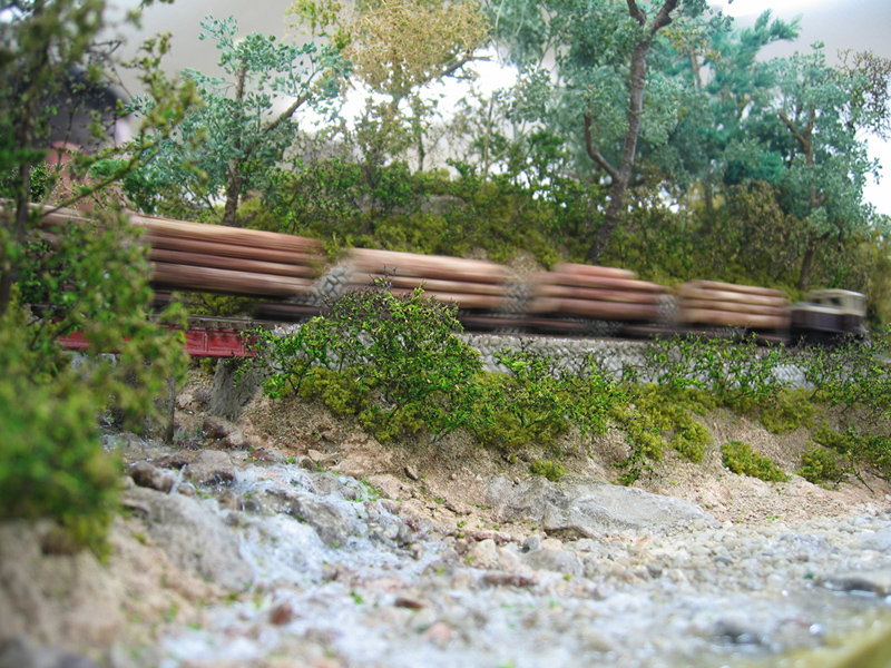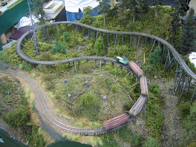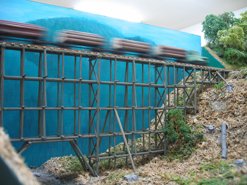 ↑蛇行するティンバートレッスルの上を走る運材列車。