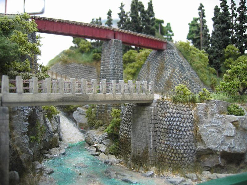 赤い小さなガーダー橋がアクセントになっています。