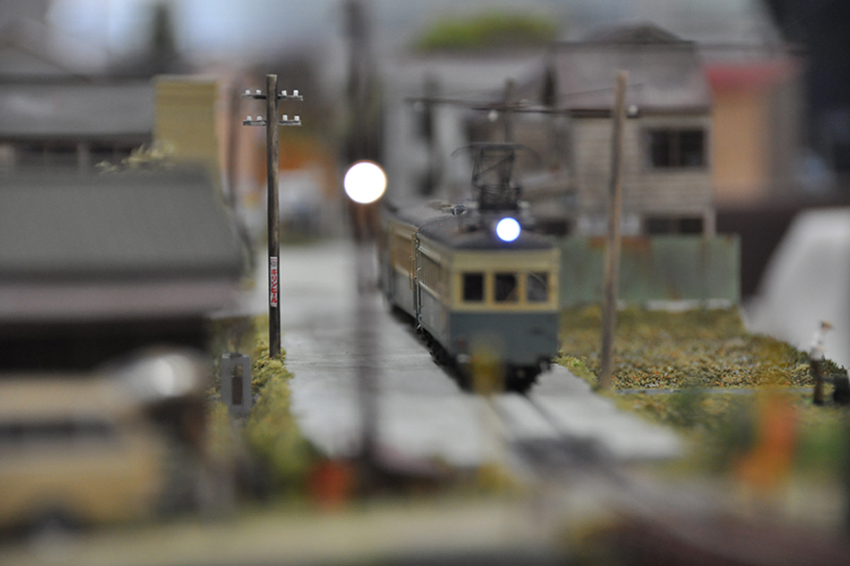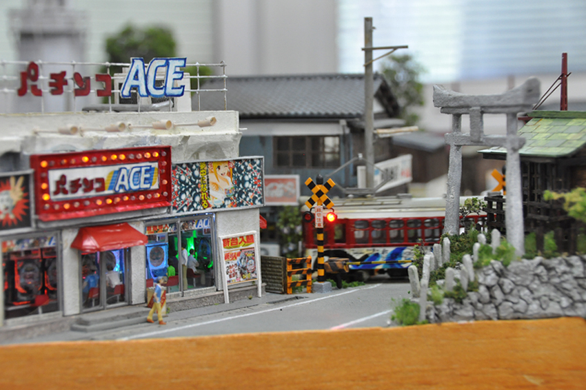 踏切の警報器だけでなく、左手前のパチンコ店の電飾も本物同様に点滅してます。