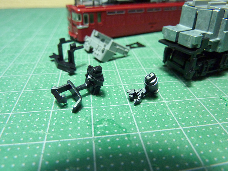 手前の左側にあるのが元から車両に取り付けられていたカプラーで、右側にあるのが交換用としてセットされているTNカプラーです。