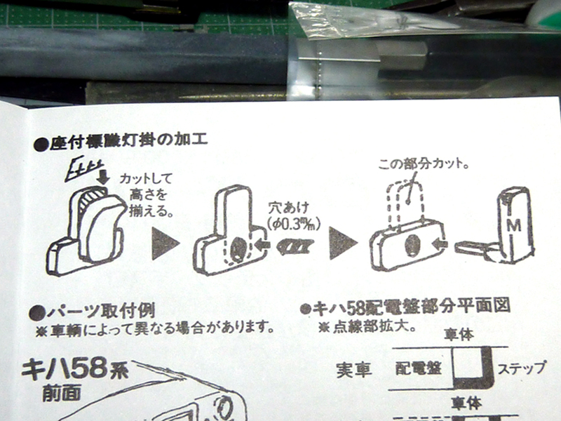 ところで、このDF50の部品取り付けの説明書を見ると、信号炎管から始まってそれぞれの部品に番号がふられて説明されているのですが、手すりパーツのランナーには説明書とは全く異なる番号がランナーに刻印されています。