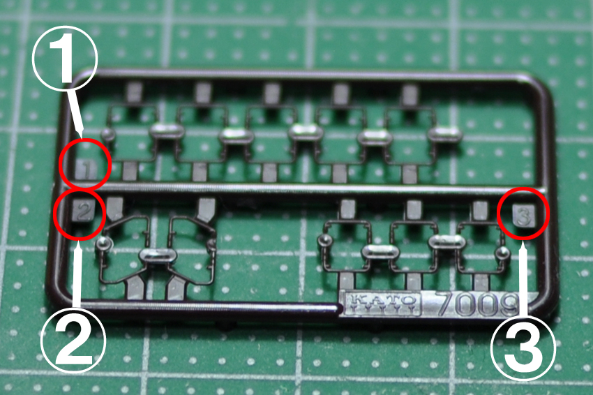 ランナー刻印の部品番号は写真の通り1・2・3となっていますが、説明書の部品通し番号(?)だと写真の「1」が「3」に、「2」が「4」になっています。